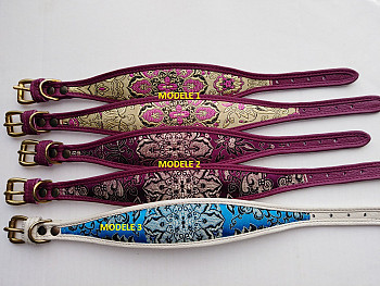 Colliers cuir garniture toile brodée, doublé, rembourrés, souples, bouclerie laiton.